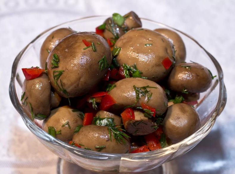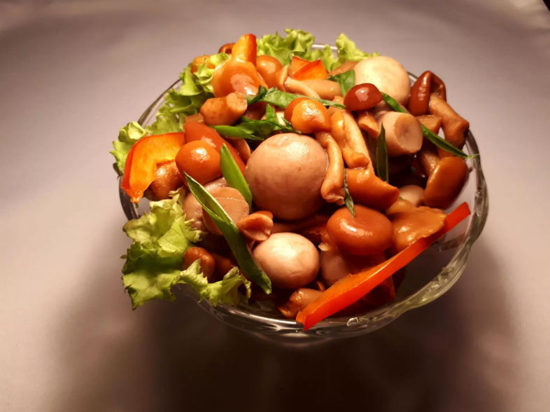 Шампиньоны маринованные, опята маринованные перец болгарский, лук зеленый, лист салата.